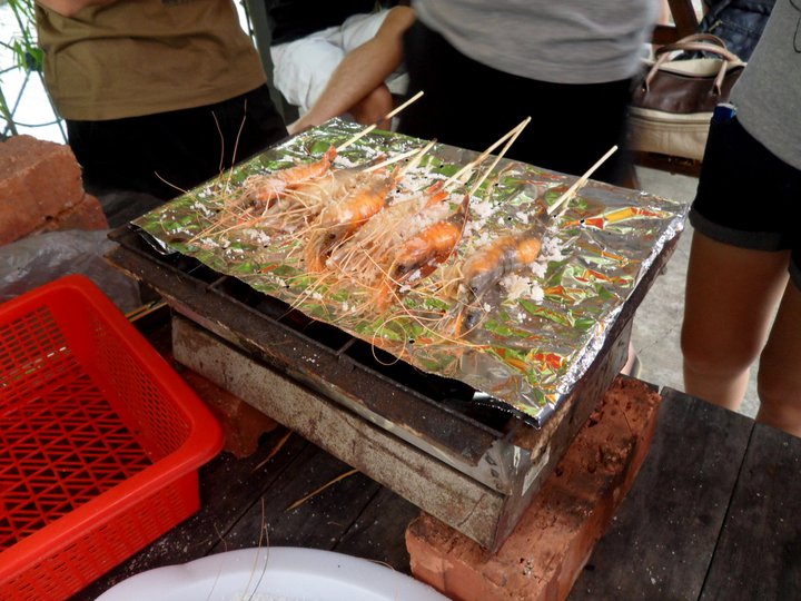 Prawns being skewed when they're still alive. Looks cruel to them right, i think so too. I myself skewed some of them. haha.